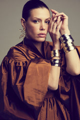 Um bracelete em formato espiral, onde o design consiste em linhas espirais que envolvem o pulso de maneira elegante e fluida. A superfície do bracelete apresenta uma textura levemente martelada, criando um efeito sutil. A combinação do formato espiral com a textura martelada confere ao acessório um toque moderno e sofisticado, ao mesmo tempo em que mantém uma aparência artesanal e única.